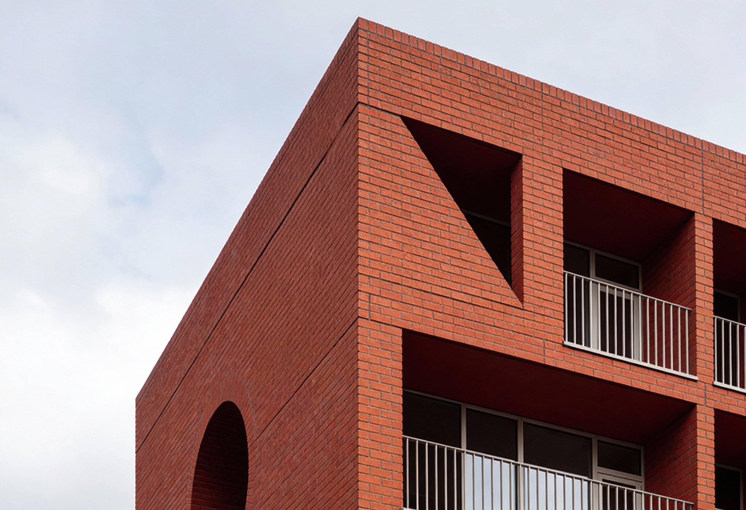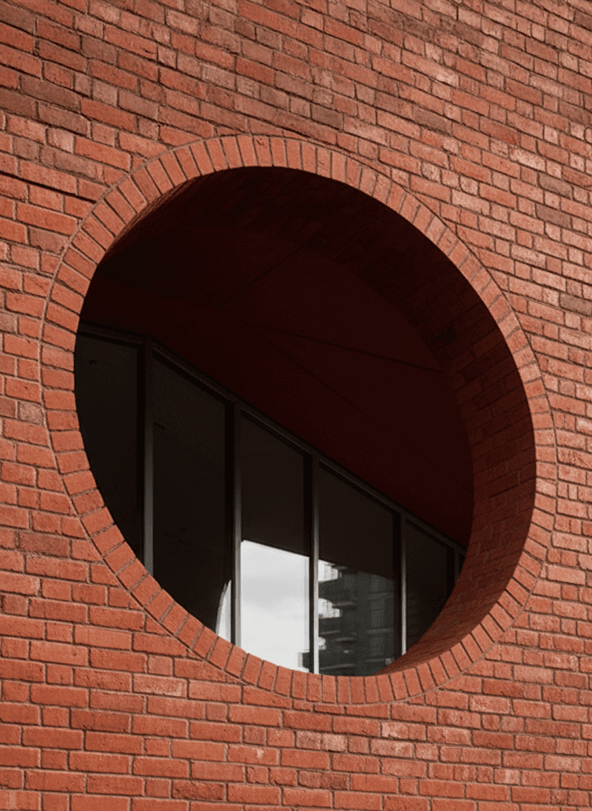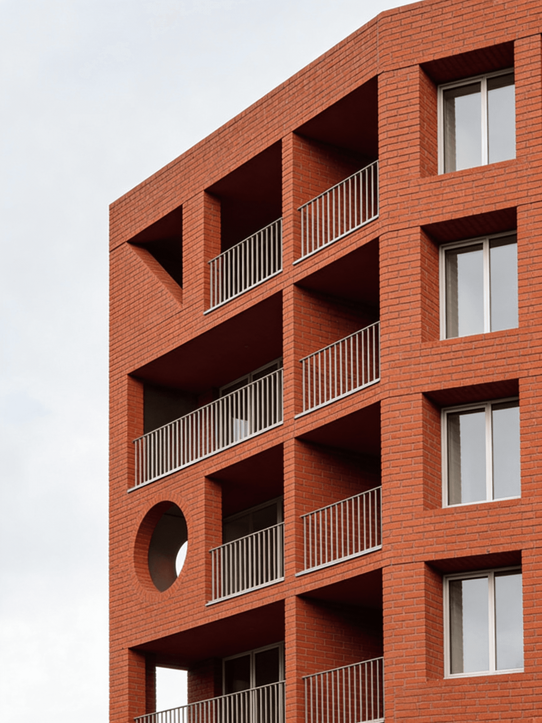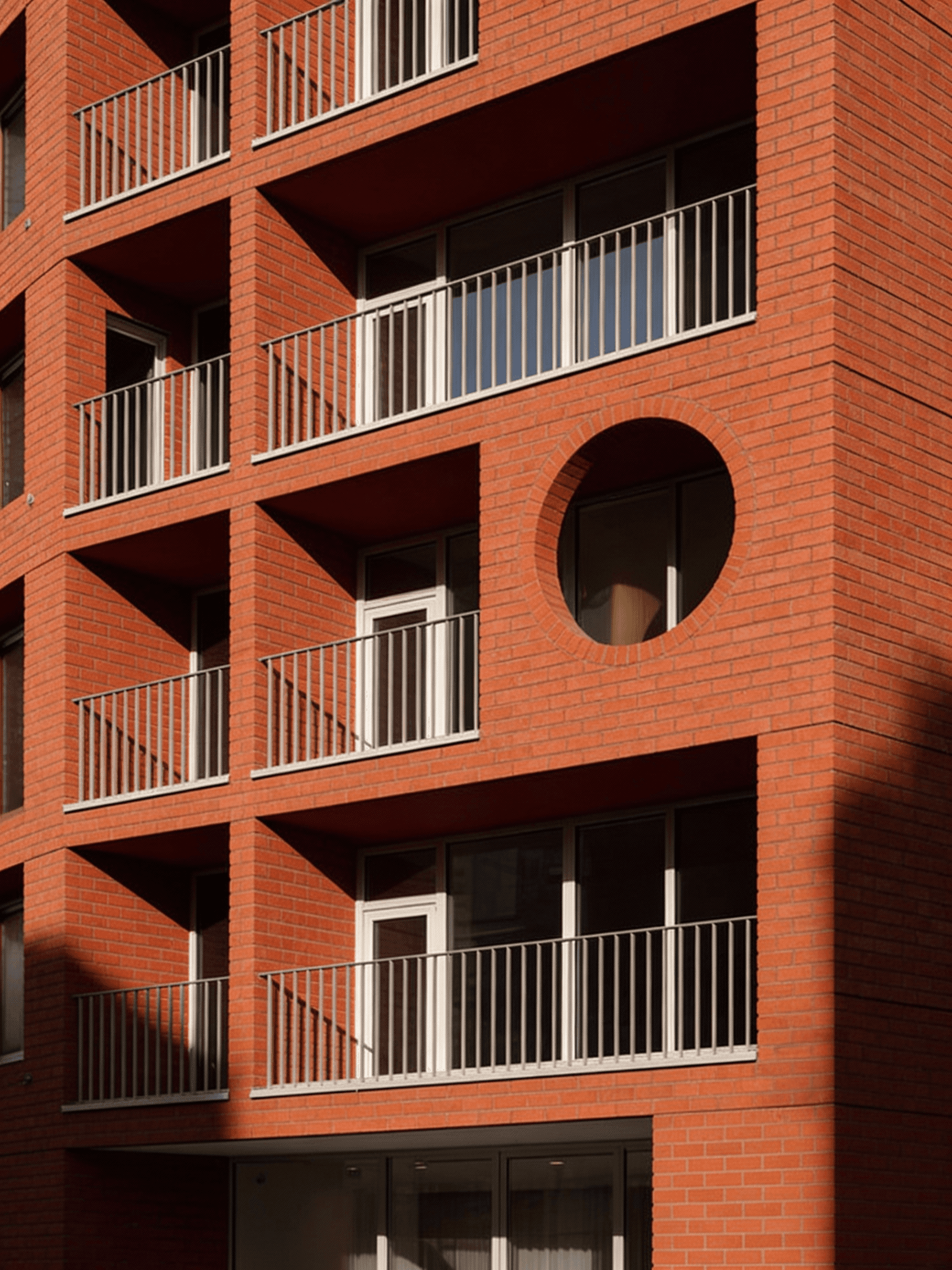 This residential building is conceived as a contemporary interpretation of early modernist principles, expressed through a disciplined use of red brick and the careful articulation of primary geometric forms. Located on a prominent urban corner in east London, the building is defined by circular and arched punctuations carved into the façade, creating moments of depth, shadow, and visual relief within an otherwise robust masonry volume. These openings are not applied decoration but integral architectural gestures that mediate between structure, light, and inhabitation. Recessed balconies and a sheltered ground floor entrance are carved from the mass, reinforcing the reading of the building as a solid form shaped by voids. The project balances monumentality with domestic scale, drawing on early modernist ideas of clarity, proportion, and material honesty while responding directly to its London context.