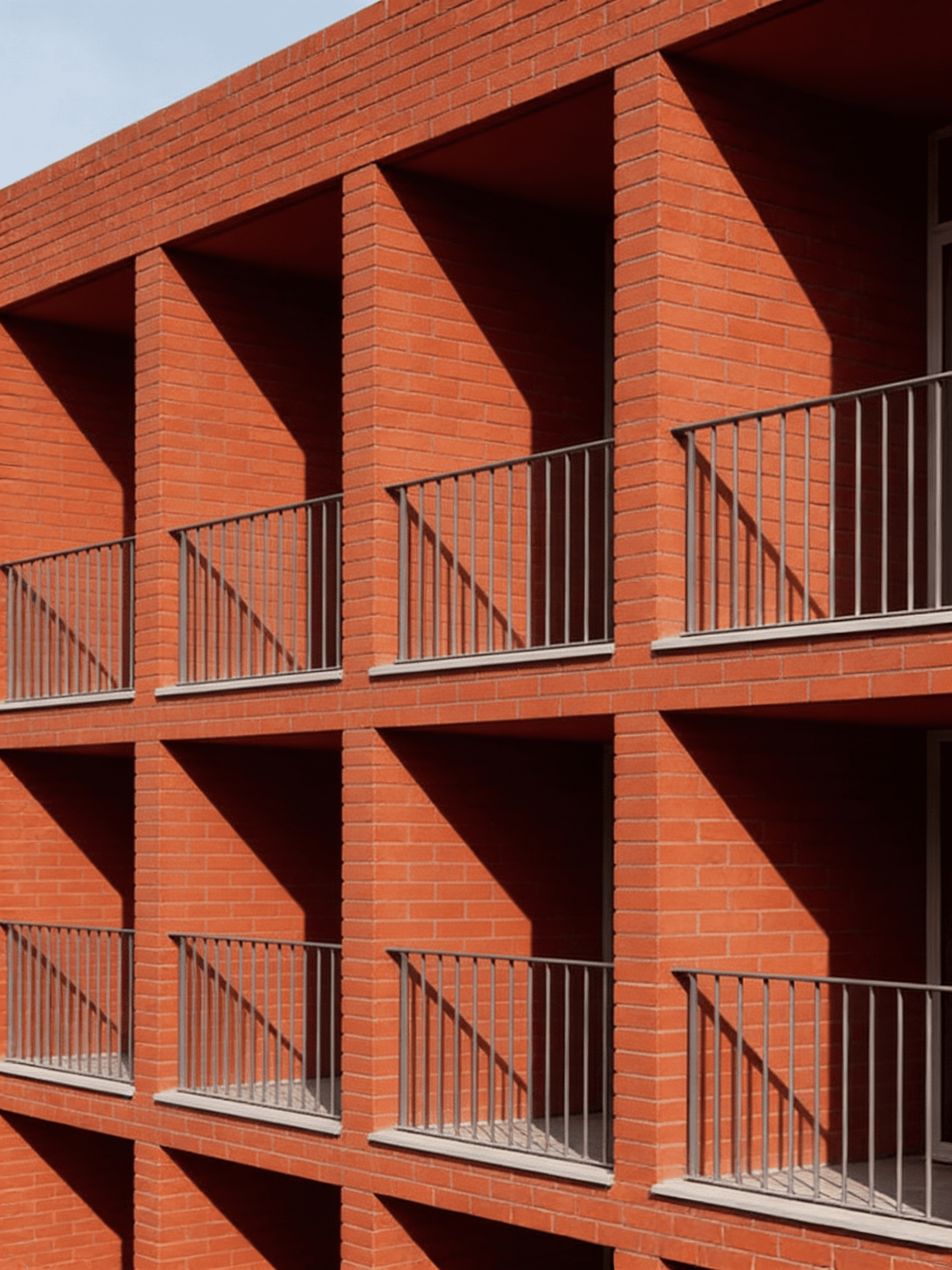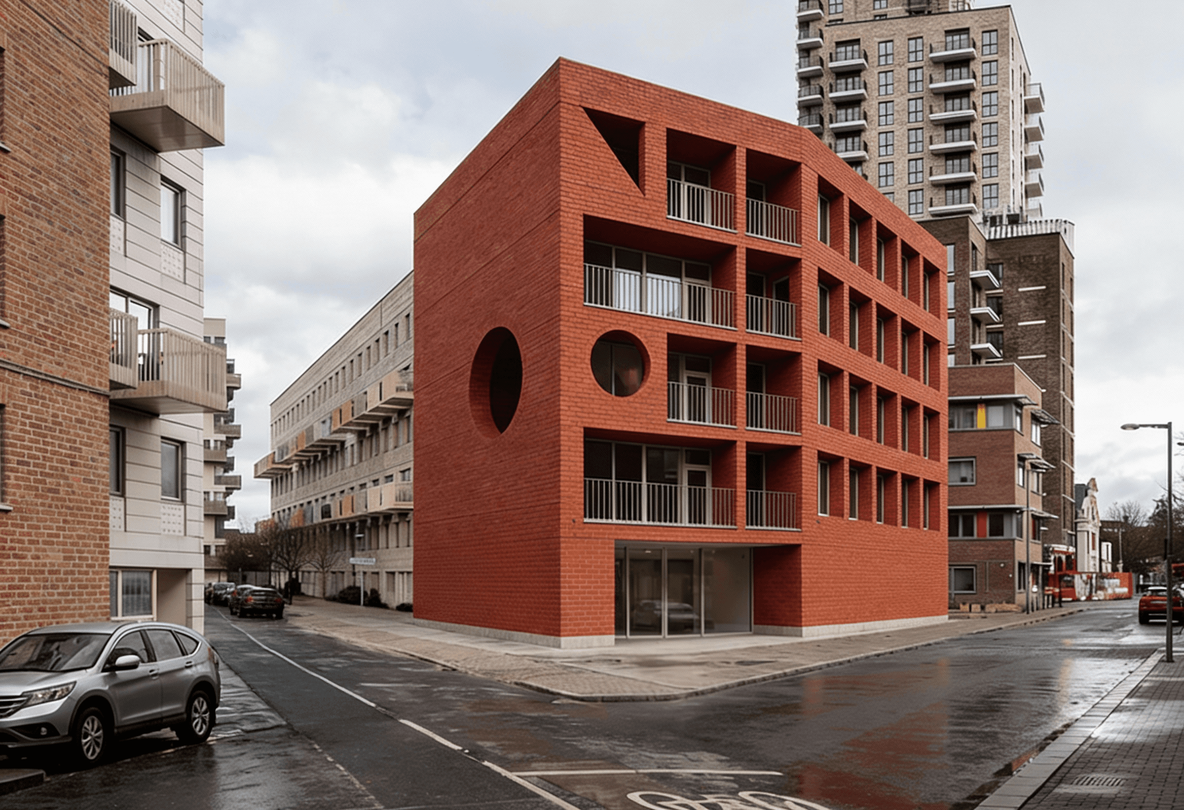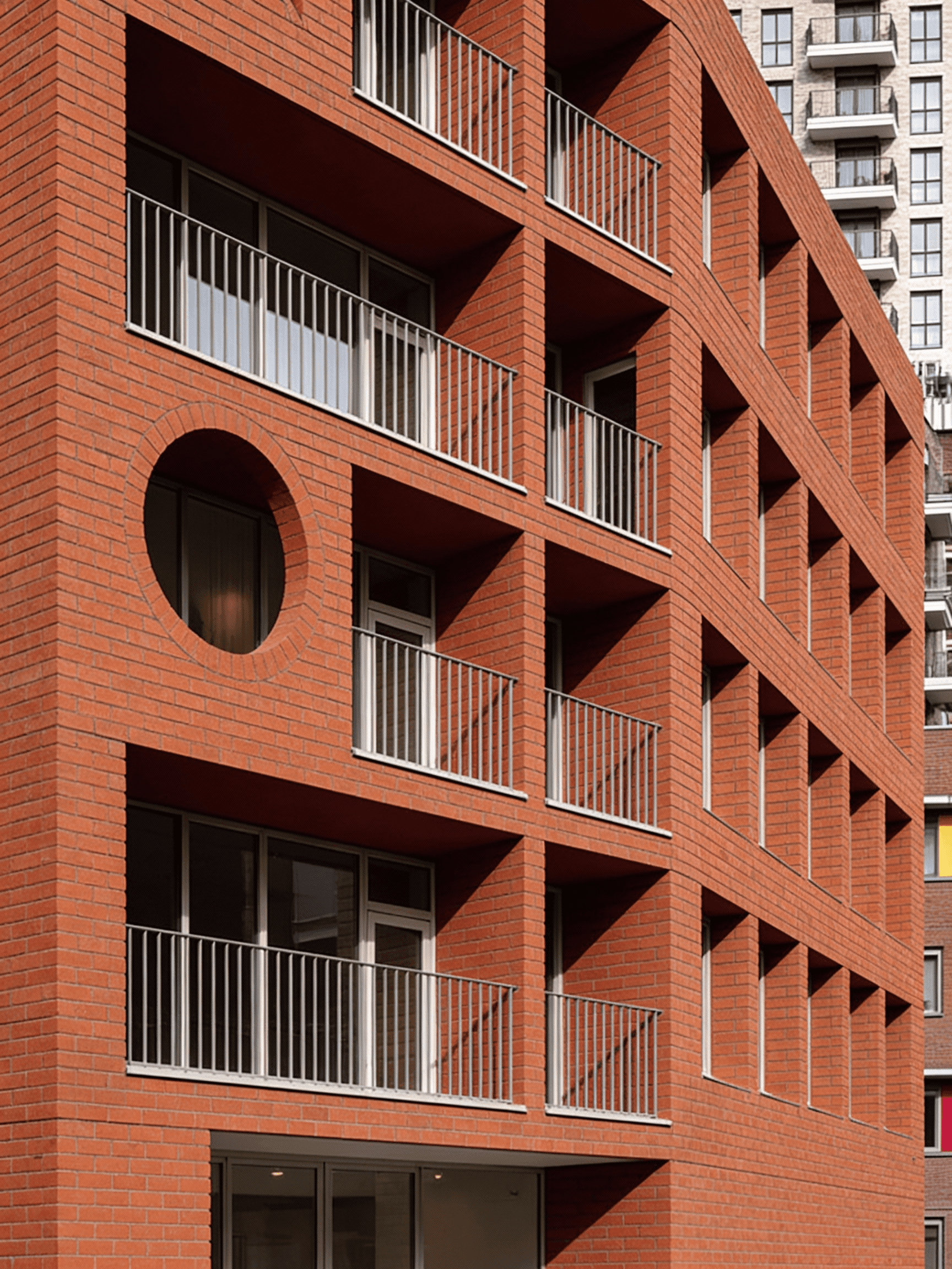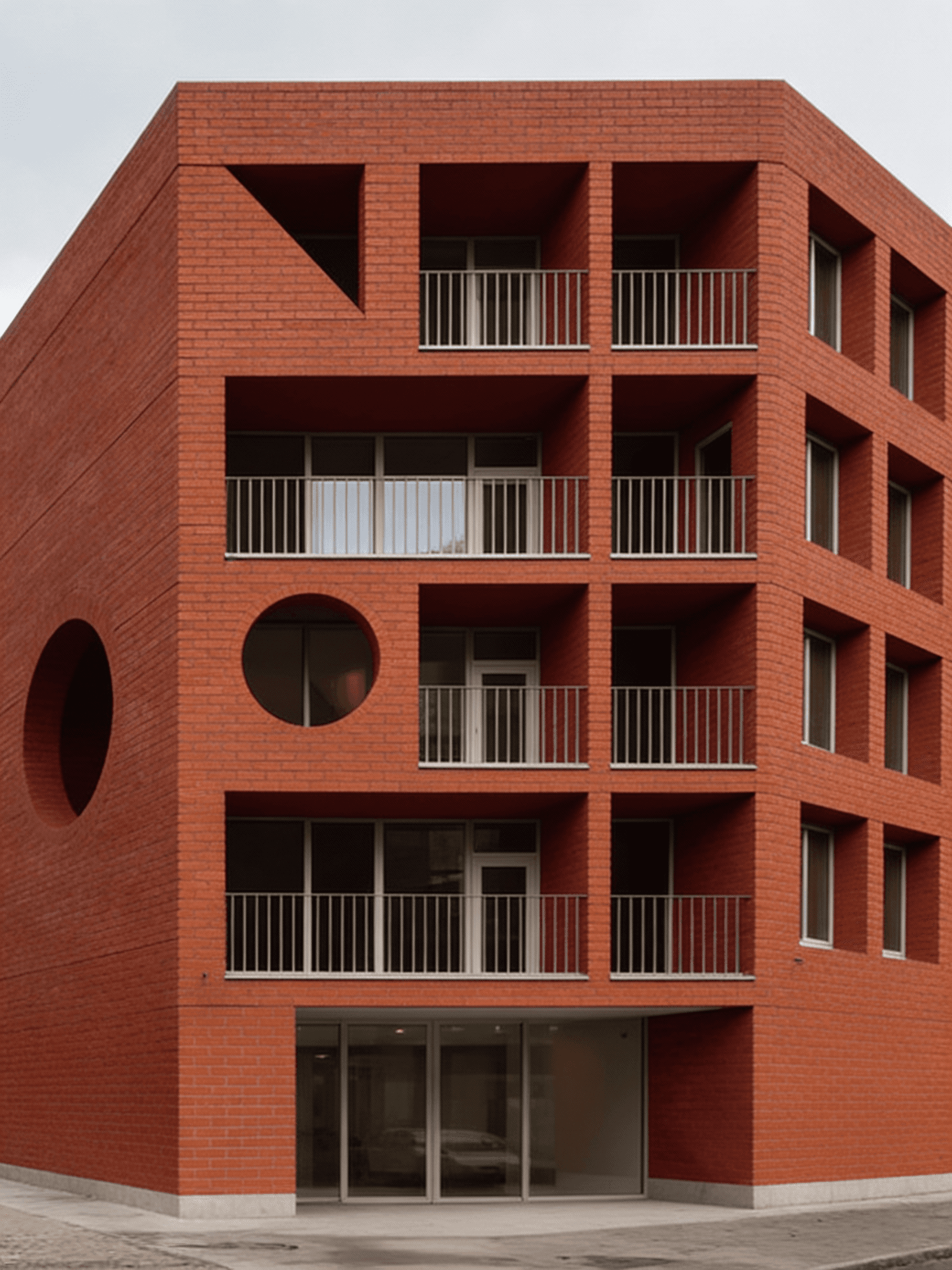 This residential building is conceived as a contemporary interpretation of early modernist principles, expressed through a disciplined use of red brick and the careful articulation of primary geometric forms. Located on a prominent urban corner in east London, the building is defined by circular and arched punctuations carved into the façade, creating moments of depth, shadow, and visual relief within an otherwise robust masonry volume. These openings are not applied decoration but integral architectural gestures that mediate between structure, light, and inhabitation. Recessed balconies and a sheltered ground floor entrance are carved from the mass, reinforcing the reading of the building as a solid form shaped by voids. The project balances monumentality with domestic scale, drawing on early modernist ideas of clarity, proportion, and material honesty while responding directly to its London context.