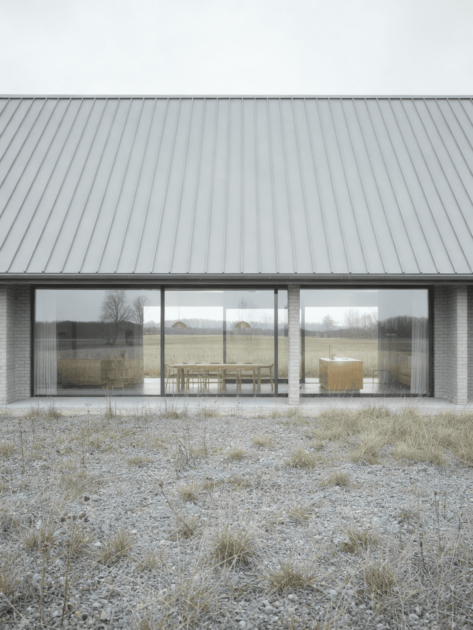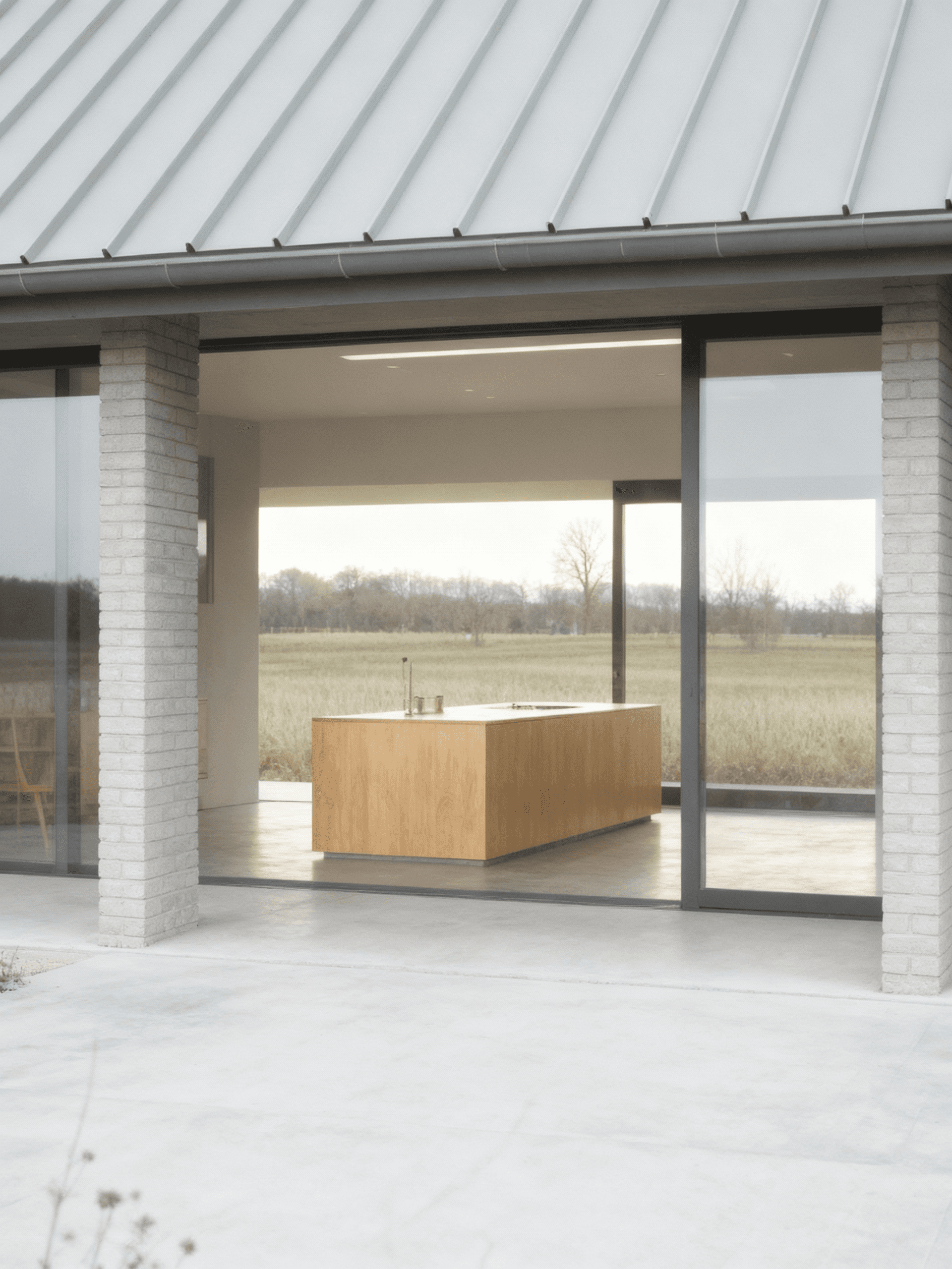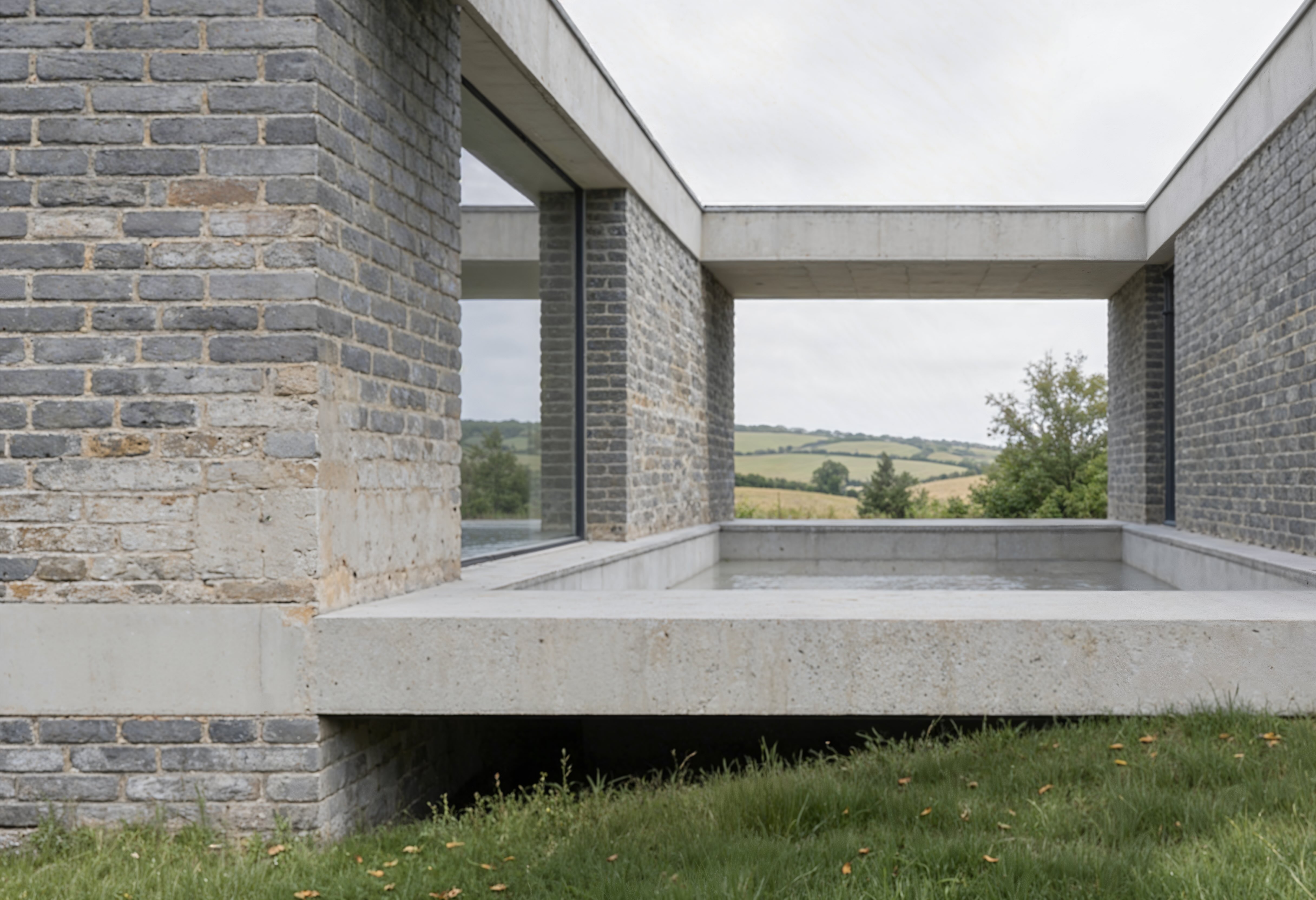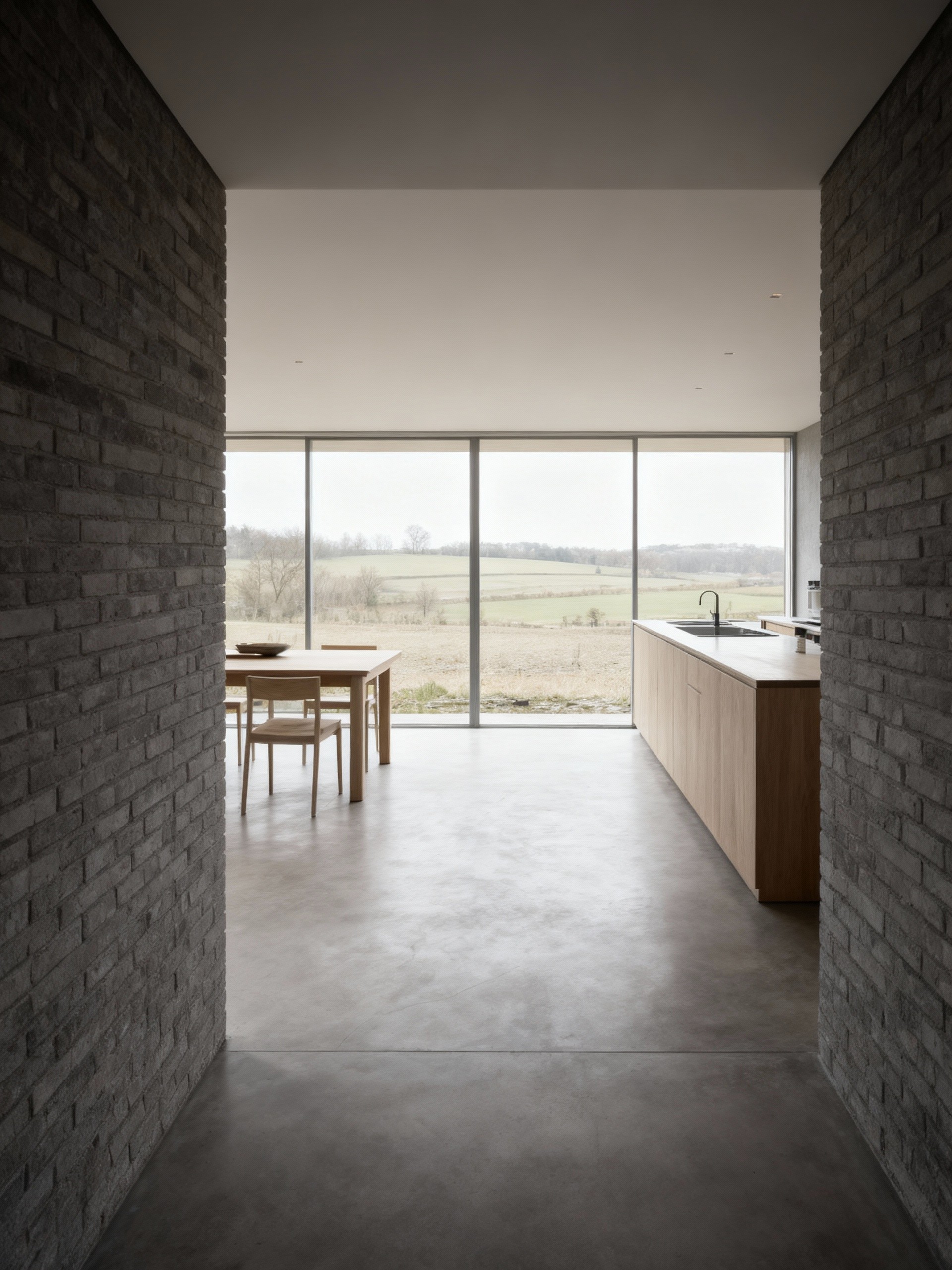 Grey House replaces a series of redundant agricultural barns with a single new dwelling that reinterprets the rural barn typology through a contemporary lens. Set within the rolling hills of the Devonshire countryside, the house adopts a quiet yet confident presence in the landscape. Its long, low form and crisp standing-seam metal roof draw from the agricultural vernacular, while refined detailing and material precision lend it a modern, architectural character. The open-plan interior is arranged around a dual-aspect kitchen, dining, and living space that frames expansive views across the site. Large-format glazing brings the landscape deep into the building, allowing light to move softly across the concrete floor and grey brick walls throughout the day. Externally, a palette of grey brick, concrete, and timber is complemented by aluminium-framed glazing and a matte metal roof, creating a dialogue between raw texture and refined finish. A light gravel pathway leads up to the house, cutting cleanly through the wild grass field, forming a calm threshold between building and terrain.