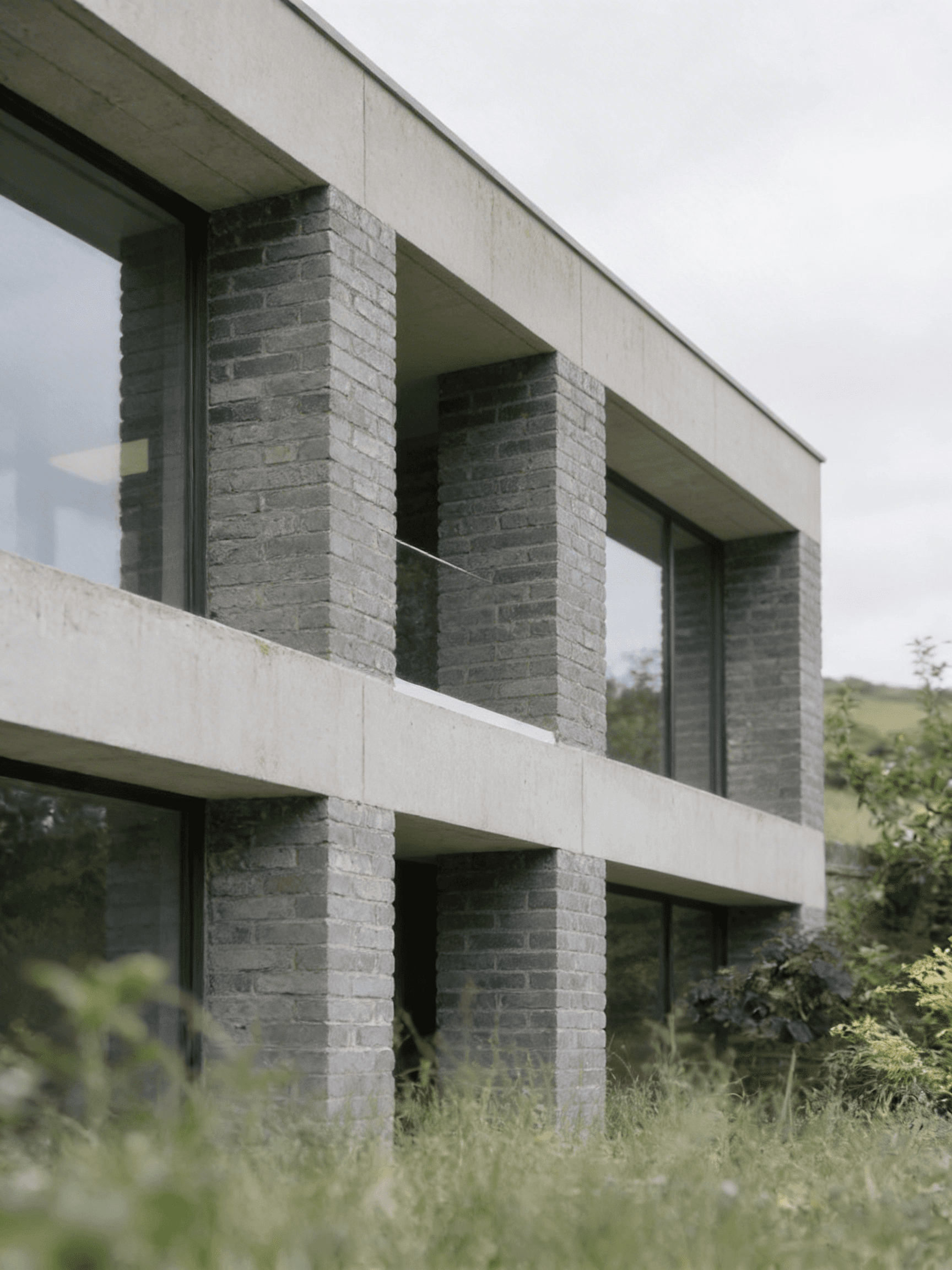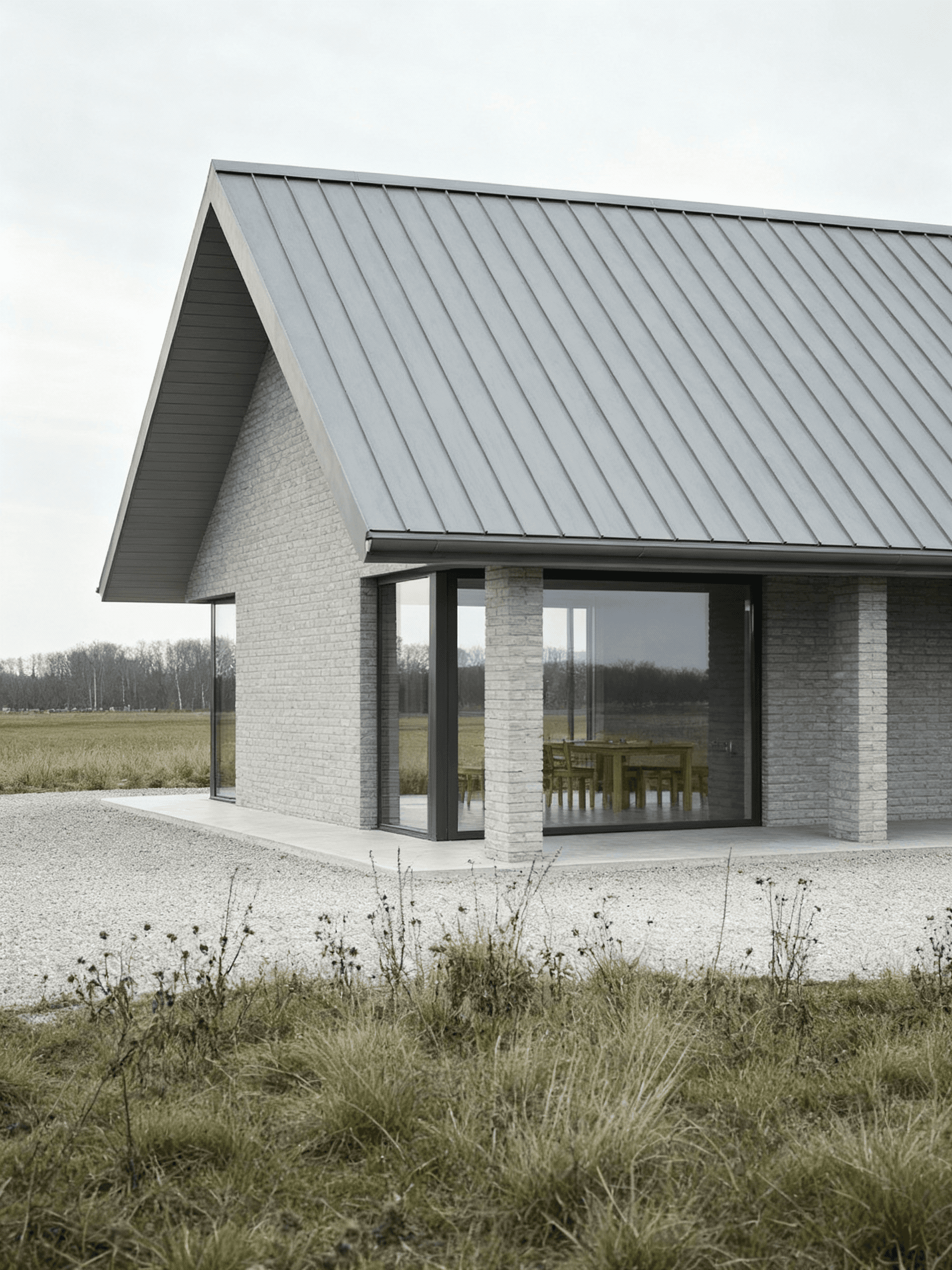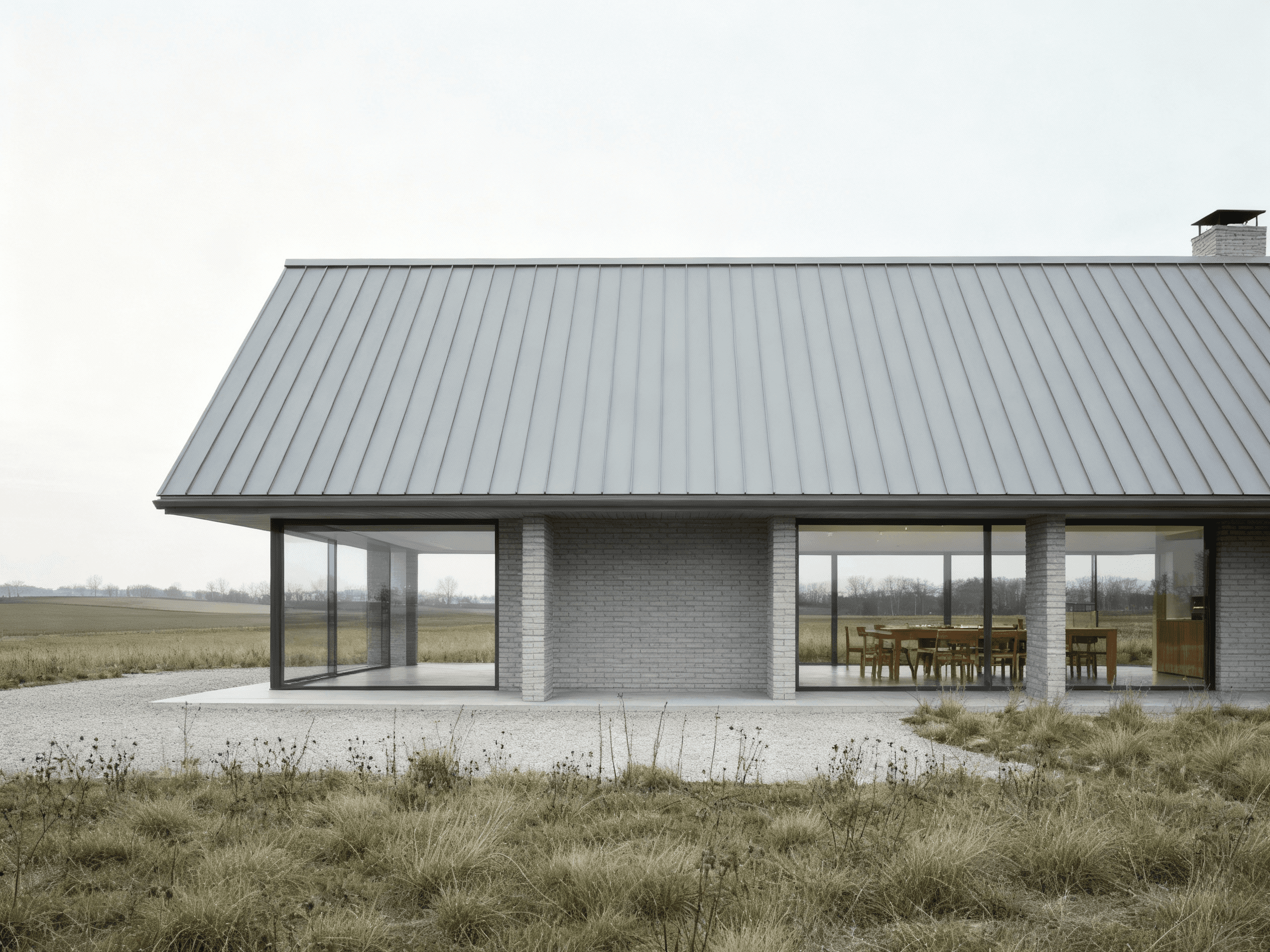 Grey House replaces a series of redundant agricultural barns with a single new dwelling that reinterprets the rural barn typology through a contemporary lens. Set within the rolling hills of the Devonshire countryside, the house adopts a quiet yet confident presence in the landscape. Its long, low form and crisp standing-seam metal roof draw from the agricultural vernacular, while refined detailing and material precision lend it a modern, architectural character. The open-plan interior is arranged around a dual-aspect kitchen, dining, and living space that frames expansive views across the site. Large-format glazing brings the landscape deep into the building, allowing light to move softly across the concrete floor and grey brick walls throughout the day. Externally, a palette of grey brick, concrete, and timber is complemented by aluminium-framed glazing and a matte metal roof, creating a dialogue between raw texture and refined finish. A light gravel pathway leads up to the house, cutting cleanly through the wild grass field, forming a calm threshold between building and terrain.