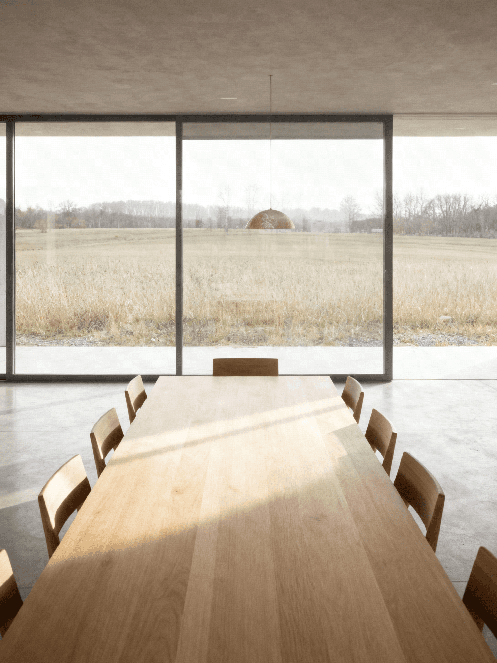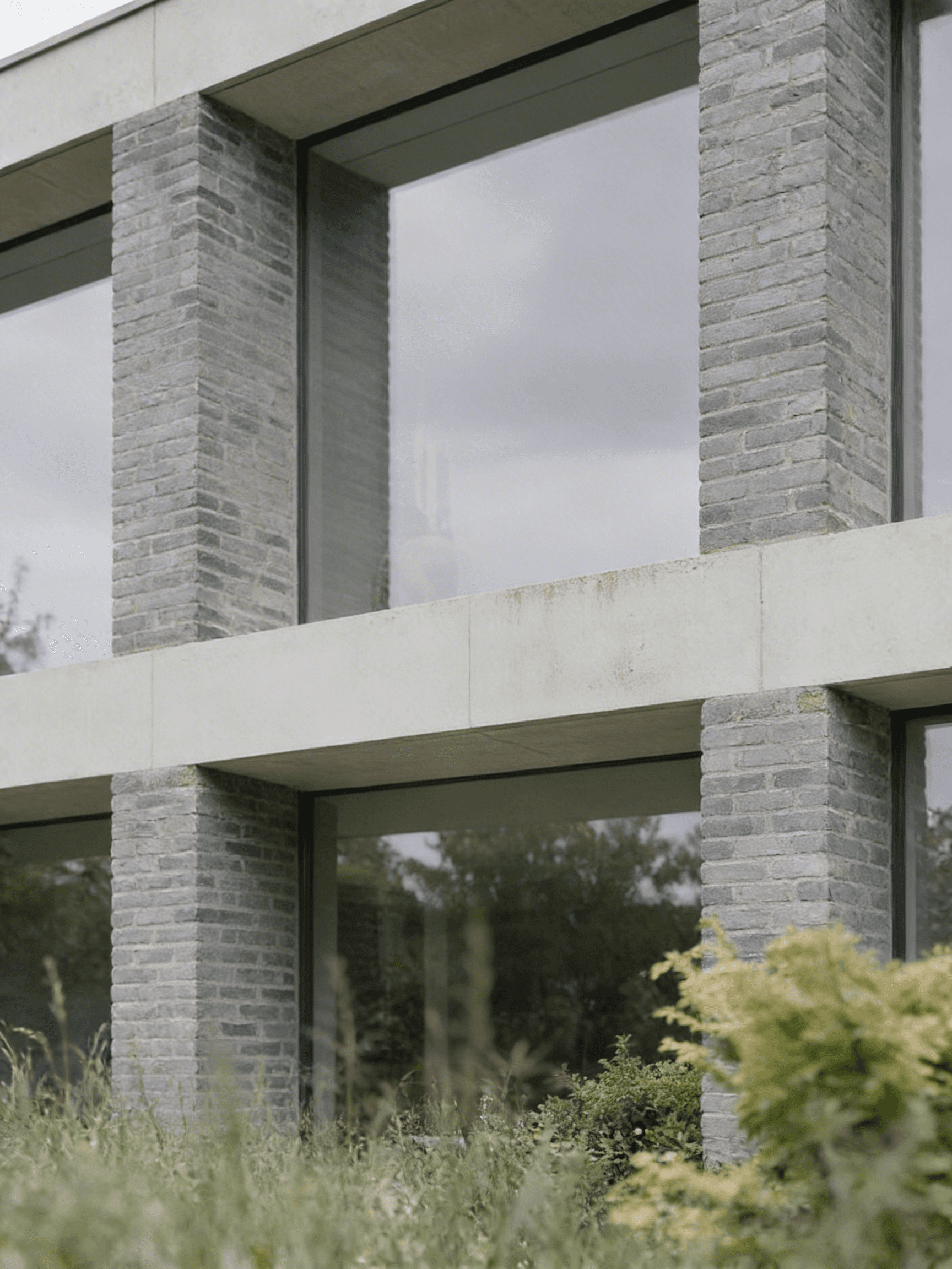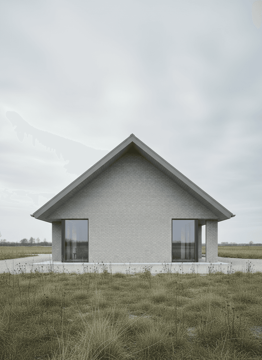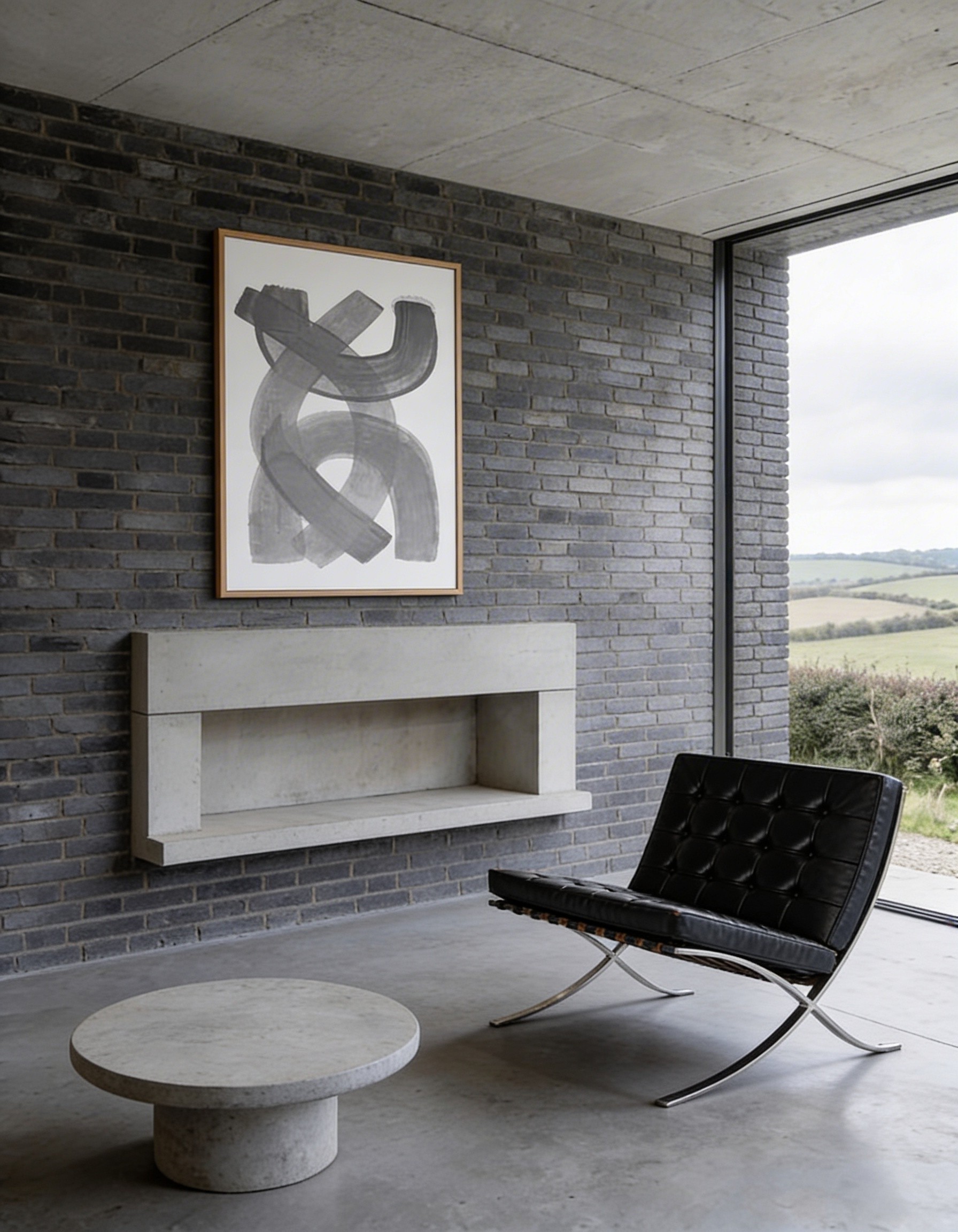 Grey House replaces a series of redundant agricultural barns with a single new dwelling that reinterprets the rural barn typology through a contemporary lens. Set within the rolling hills of the Devonshire countryside, the house adopts a quiet yet confident presence in the landscape. Its long, low form and crisp standing-seam metal roof draw from the agricultural vernacular, while refined detailing and material precision lend it a modern, architectural character. The open-plan interior is arranged around a dual-aspect kitchen, dining, and living space that frames expansive views across the site. Large-format glazing brings the landscape deep into the building, allowing light to move softly across the concrete floor and grey brick walls throughout the day. Externally, a palette of grey brick, concrete, and timber is complemented by aluminium-framed glazing and a matte metal roof, creating a dialogue between raw texture and refined finish. A light gravel pathway leads up to the house, cutting cleanly through the wild grass field, forming a calm threshold between building and terrain.
