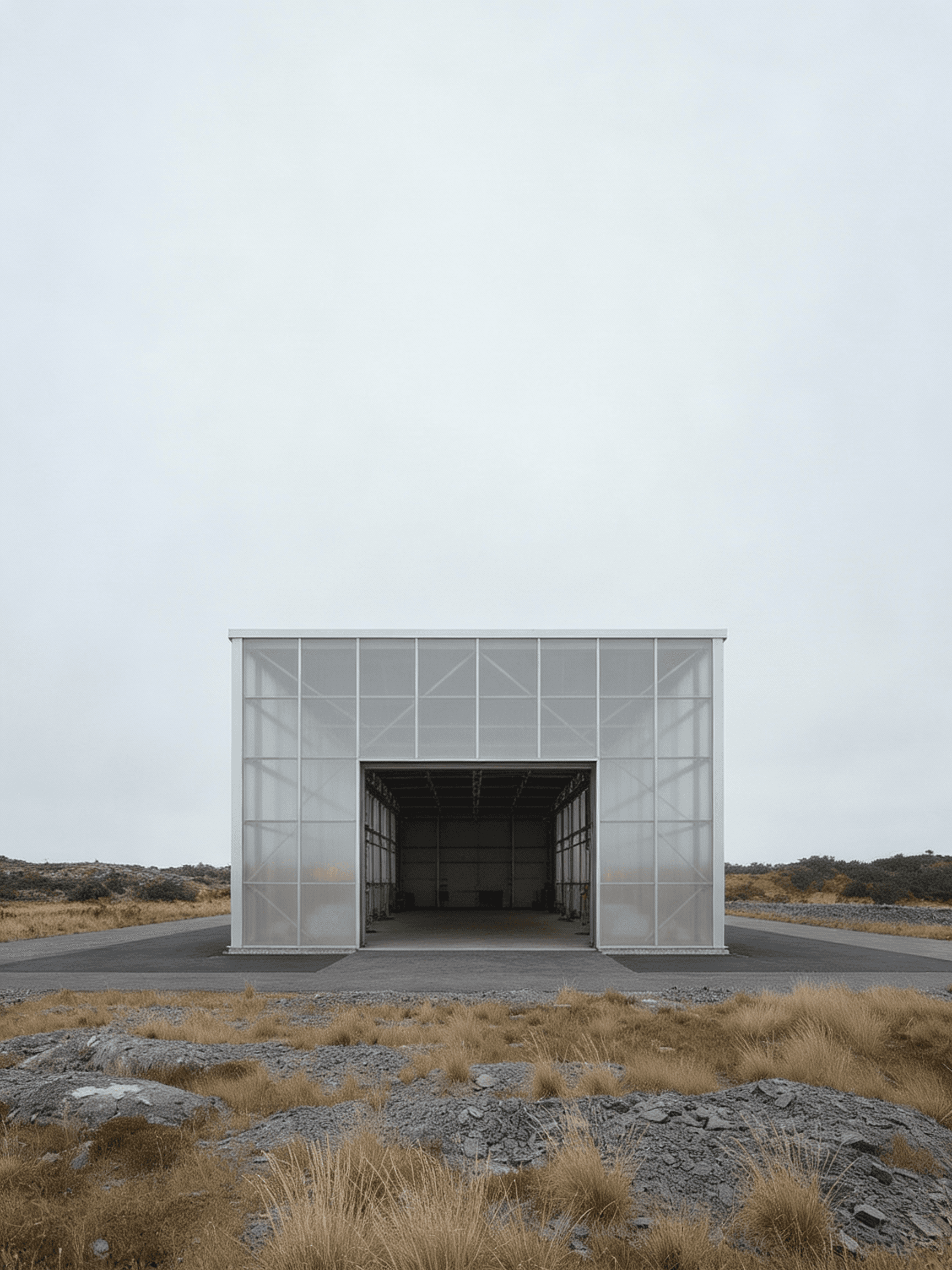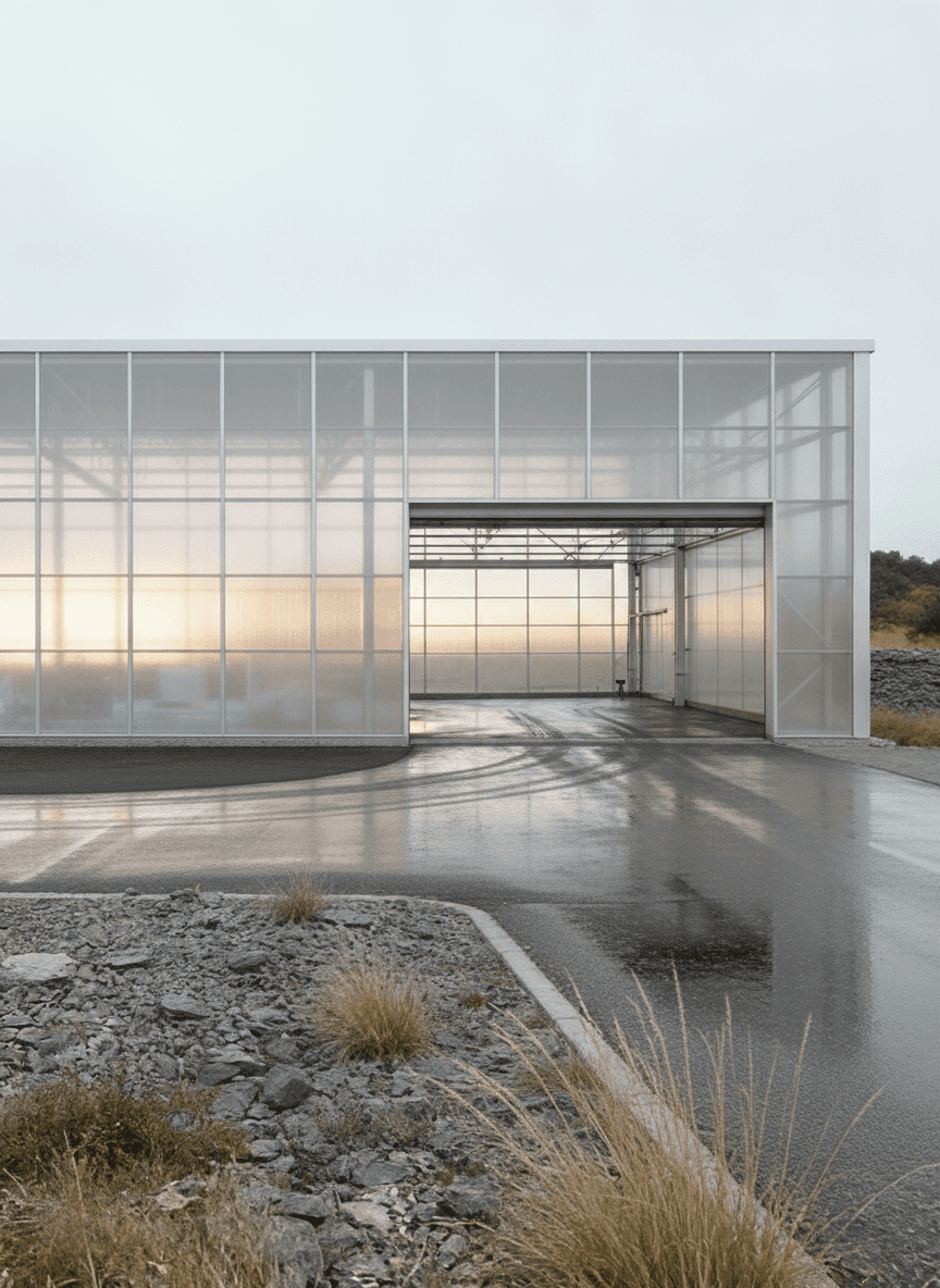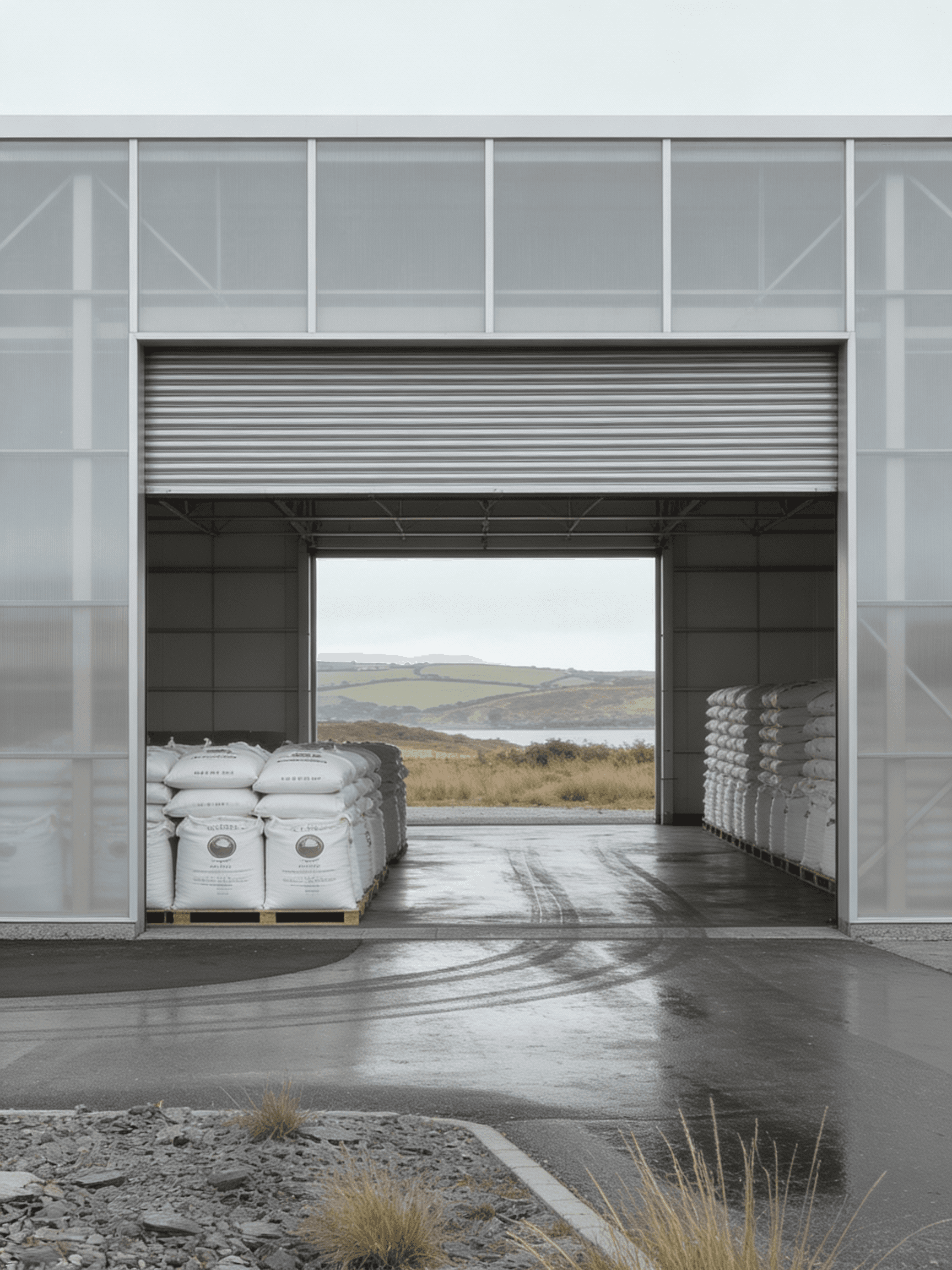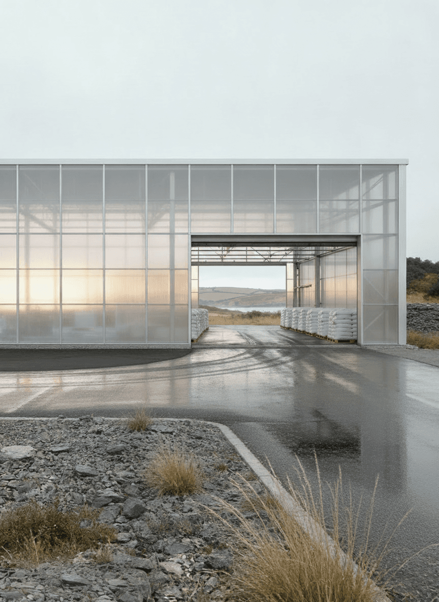 The Roast House is conceived as a refined industrial structure for the storage and handling of coffee, located within the exposed landscape of north Cornwall and designed for a local coffee manufacturer. The project explores beauty in industrial materials through a restrained architectural language that prioritises clarity, proportion, and material honesty. Expressed as a simple elongated volume, the building’s form is driven directly by operational requirements, structure, and environmental control rather than applied formal gestures. A lightweight, translucent envelope wraps a primary steel frame, allowing soft daylight to penetrate the interior while moderating the building’s presence within the surrounding landscape. By day the façade reads as calm and utilitarian; by night it becomes a gently illuminated container that reveals the rhythm of structure and use within. Industrial elements including steel framing, cladding panels, roller shutters, and concrete ground planes are left exposed and carefully detailed, reinforcing the building as a functional object shaped by necessity. Set against the rugged terrain of north Cornwall, the project balances infrastructural efficiency with a quiet sensitivity to place, demonstrating how industrial architecture can achieve an enduring and composed presence through simplicity, light, and material integrity.