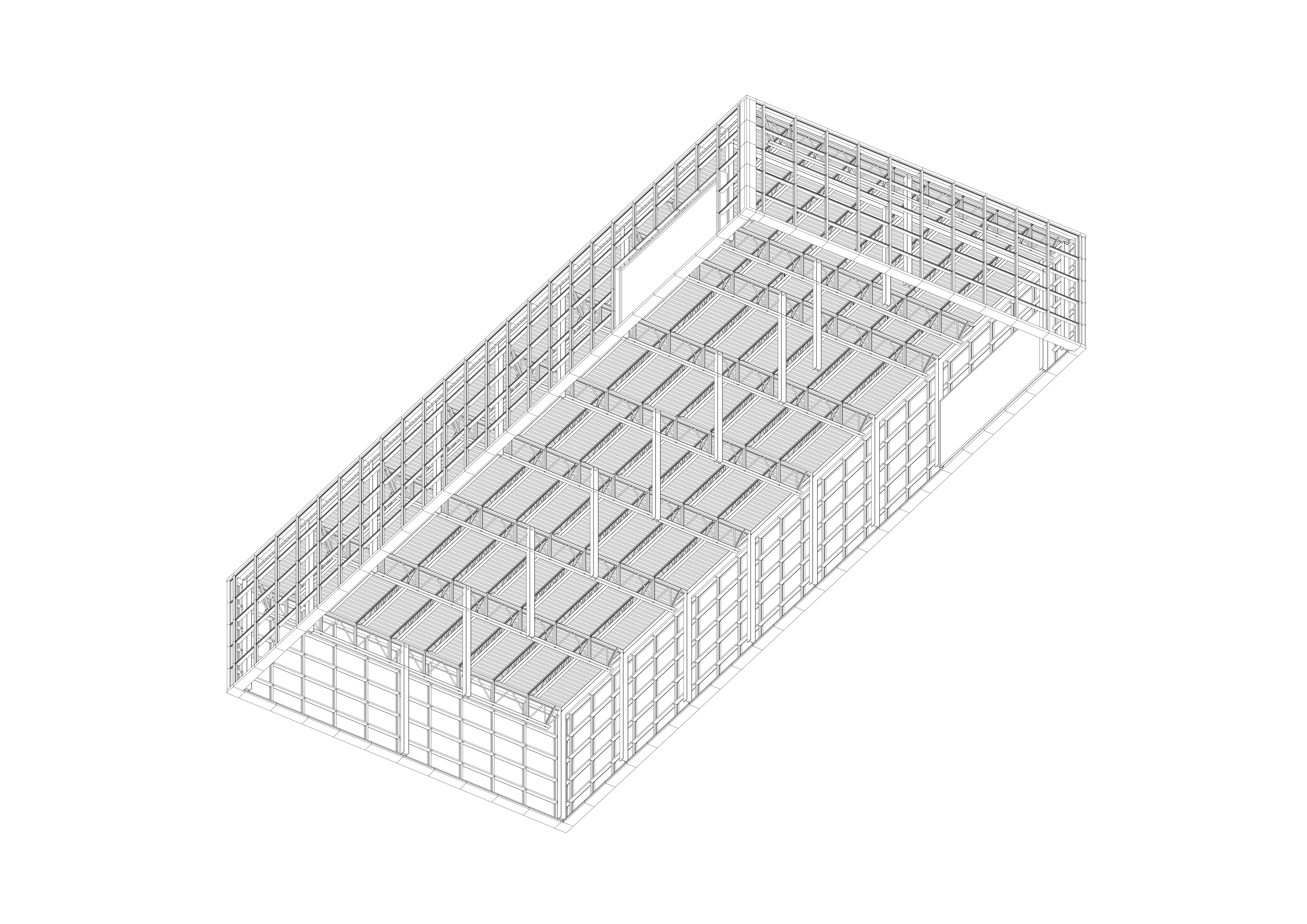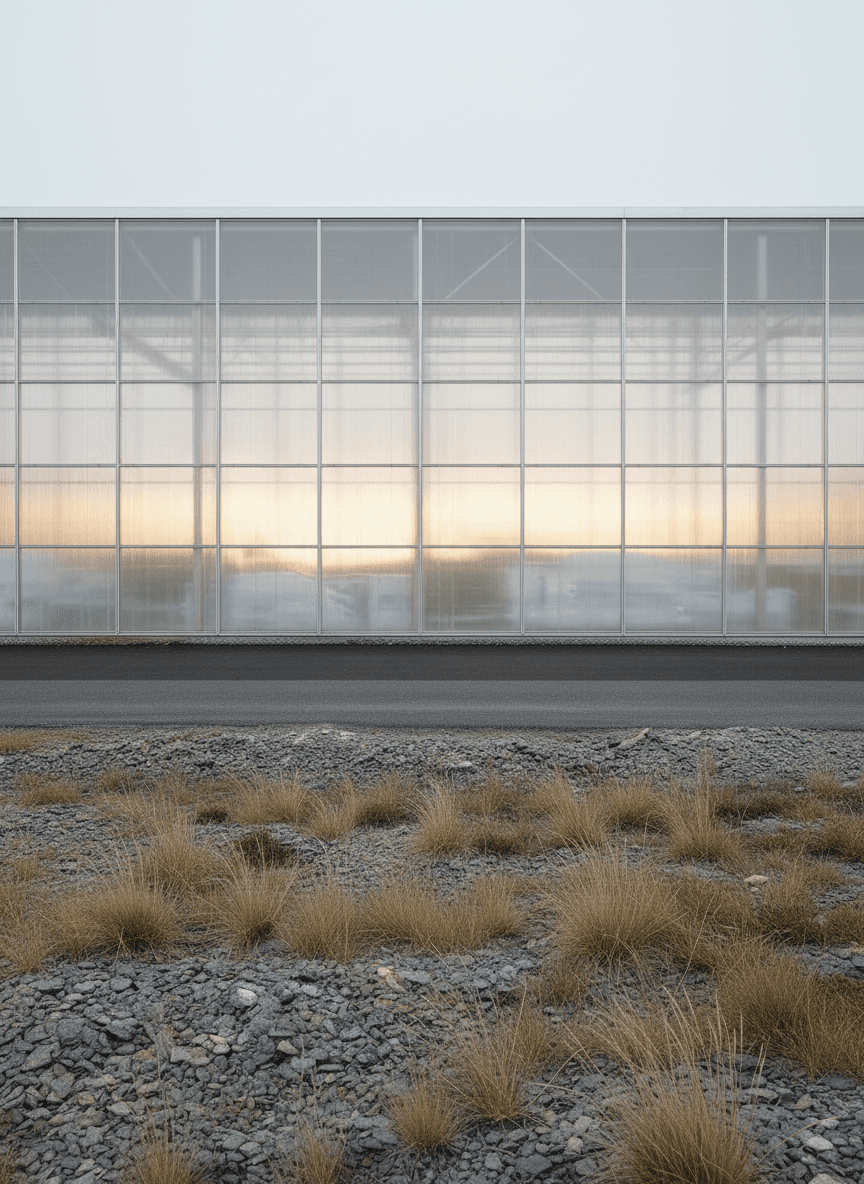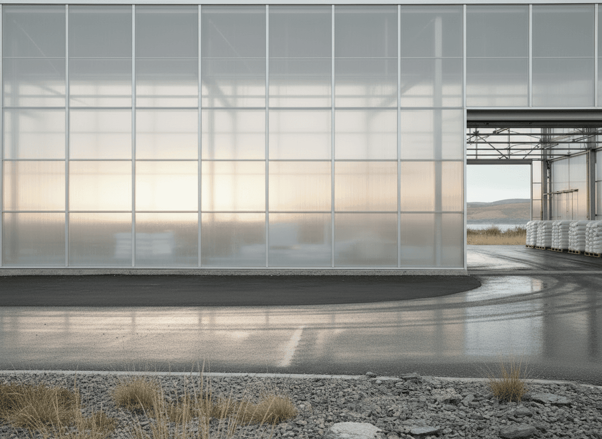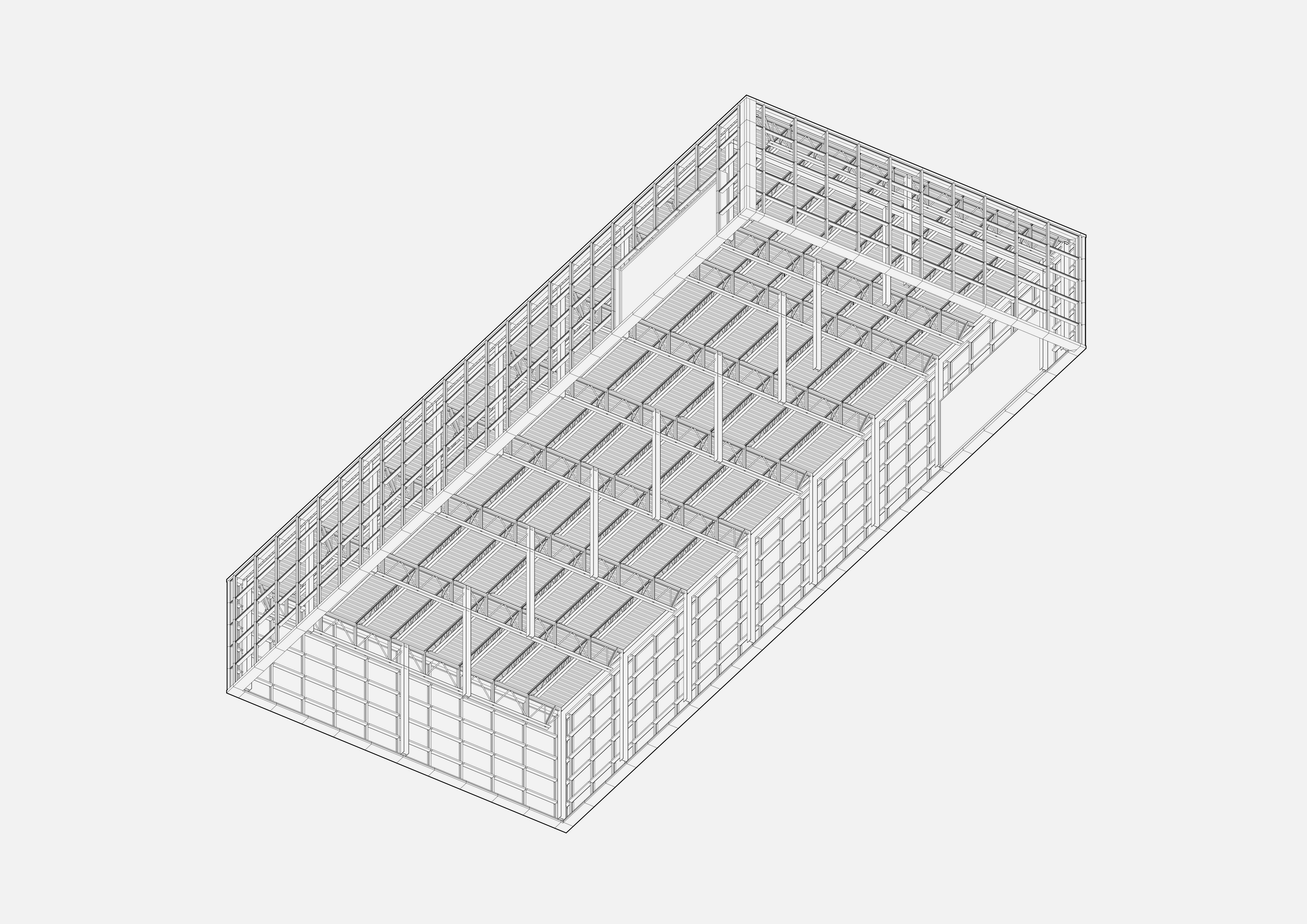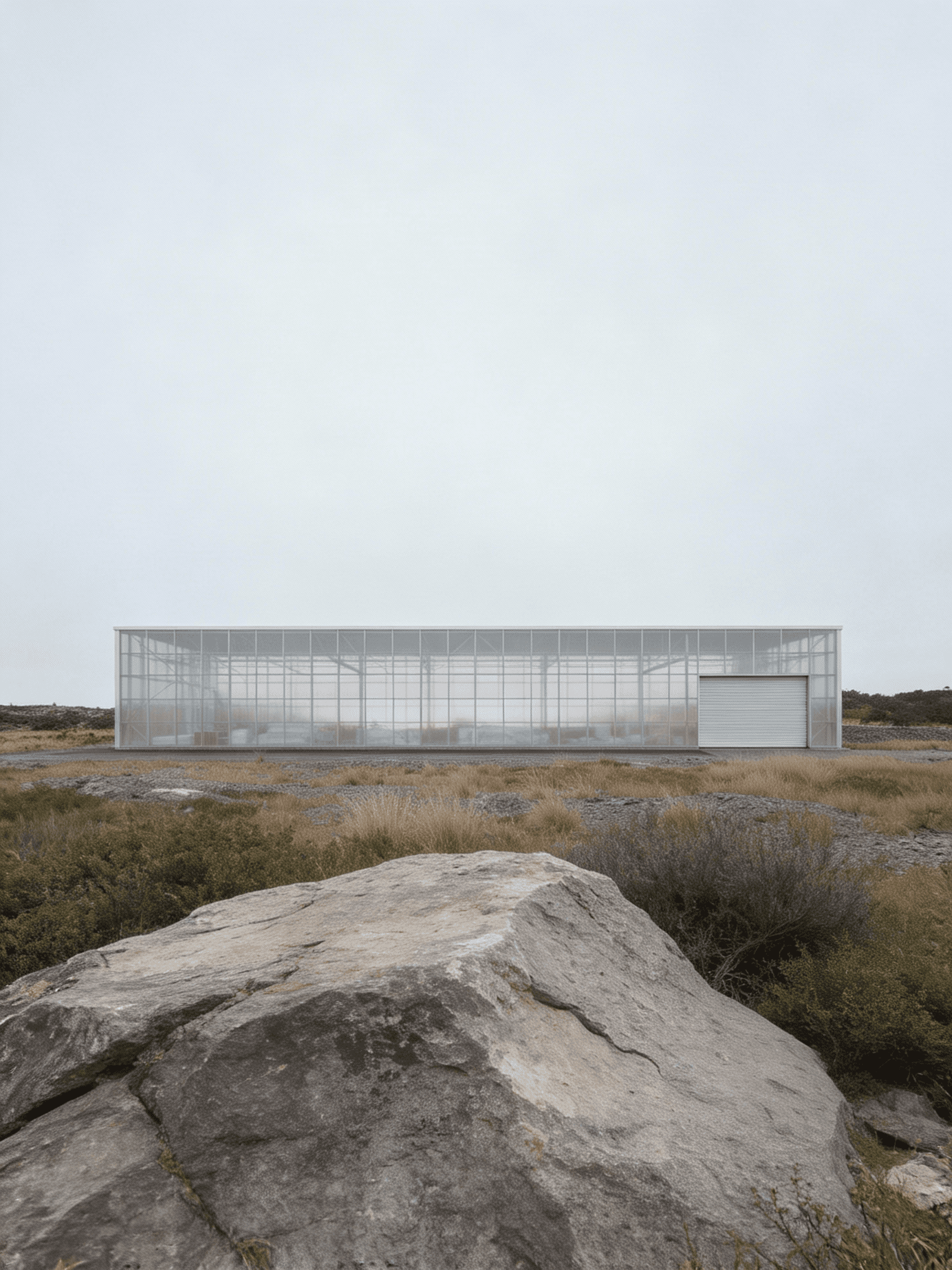 The Roast House is conceived as a refined industrial structure for the storage and handling of coffee, located within the exposed landscape of north Cornwall and designed for a local coffee manufacturer. The project explores beauty in industrial materials through a restrained architectural language that prioritises clarity, proportion, and material honesty. Expressed as a simple elongated volume, the building’s form is driven directly by operational requirements, structure, and environmental control rather than applied formal gestures. A lightweight, translucent envelope wraps a primary steel frame, allowing soft daylight to penetrate the interior while moderating the building’s presence within the surrounding landscape. By day the façade reads as calm and utilitarian; by night it becomes a gently illuminated container that reveals the rhythm of structure and use within. Industrial elements including steel framing, cladding panels, roller shutters, and concrete ground planes are left exposed and carefully detailed, reinforcing the building as a functional object shaped by necessity. Set against the rugged terrain of north Cornwall, the project balances infrastructural efficiency with a quiet sensitivity to place, demonstrating how industrial architecture can achieve an enduring and composed presence through simplicity, light, and material integrity.