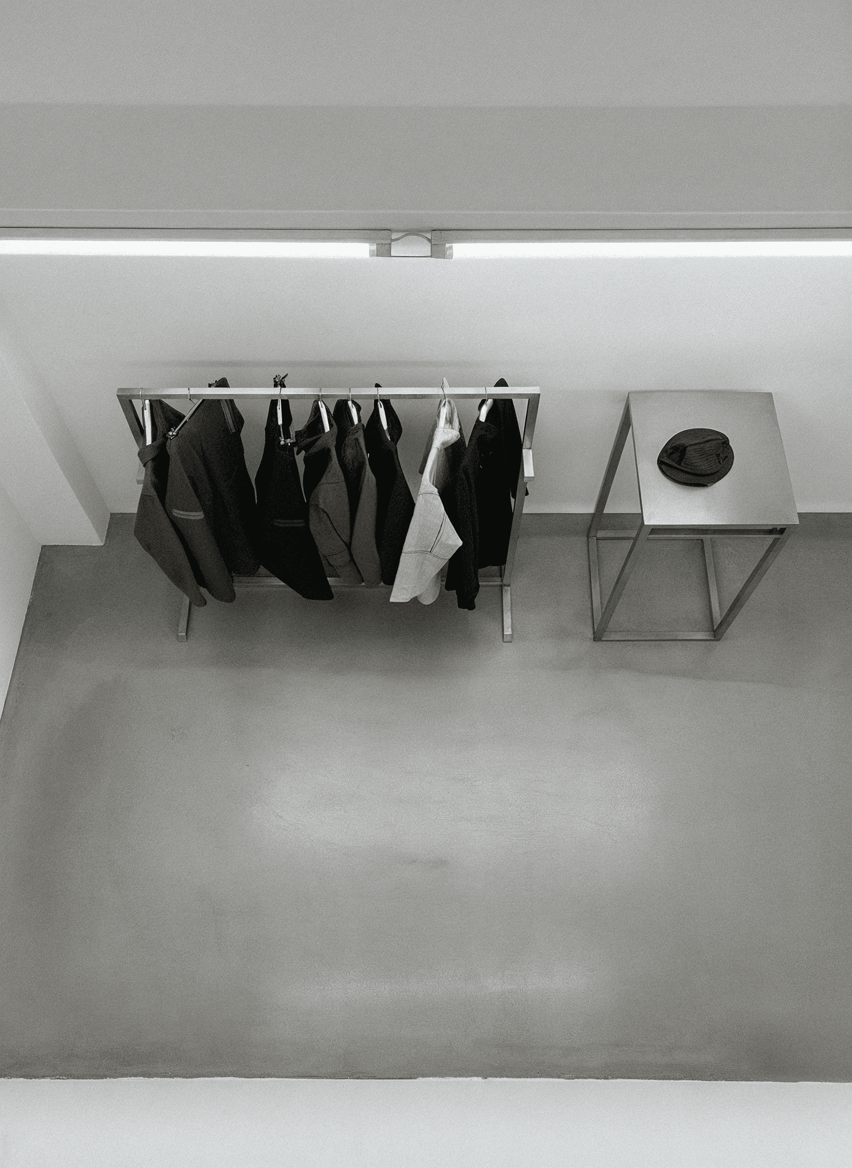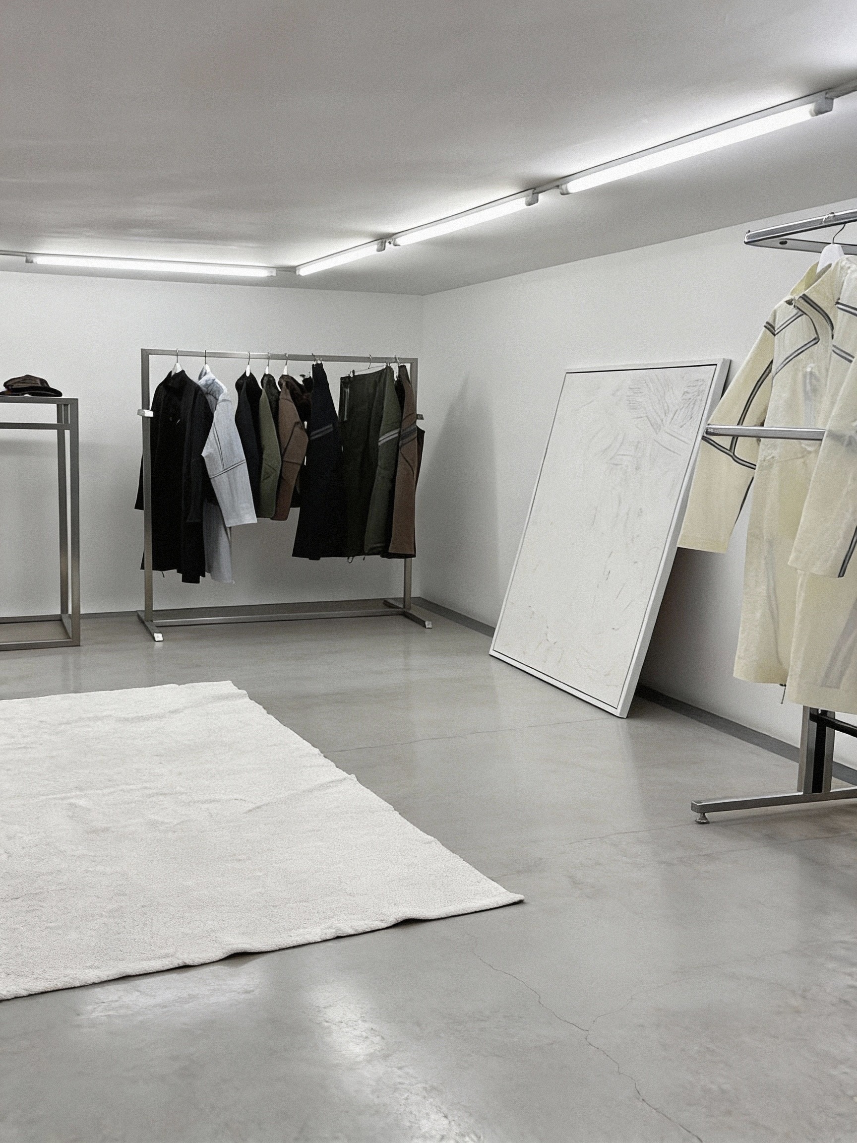 The Impossible Objects Paris showroom was conceived as a temporary interior environment for Paris Men’s Fashion Week 2023, designed to present a curated selection of international fashion and product brands within a unified architectural framework. The project was informed by early modernist principles and the radical spatial thinking of Archizoom Associati, particularly their use of repetition, continuity, and non-hierarchical space. These references shaped a restrained design language in which lighting, structure, and display operate as a continuous field rather than as isolated elements. A linear, continuous lighting system was developed as the primary organising device, extending throughout the showroom to establish rhythm, orientation, and spatial clarity, while supporting the flexible arrangement of furniture and display elements. The interior prioritised neutrality, proportion, and legibility, allowing individual brand identities to be read clearly within a calm, consistent environment. The result is a functional yet sculptural temporary architecture that balances precision, flexibility, and material restraint, aligning with Impossible Objects’ design-led approach to contemporary brand presentation.
